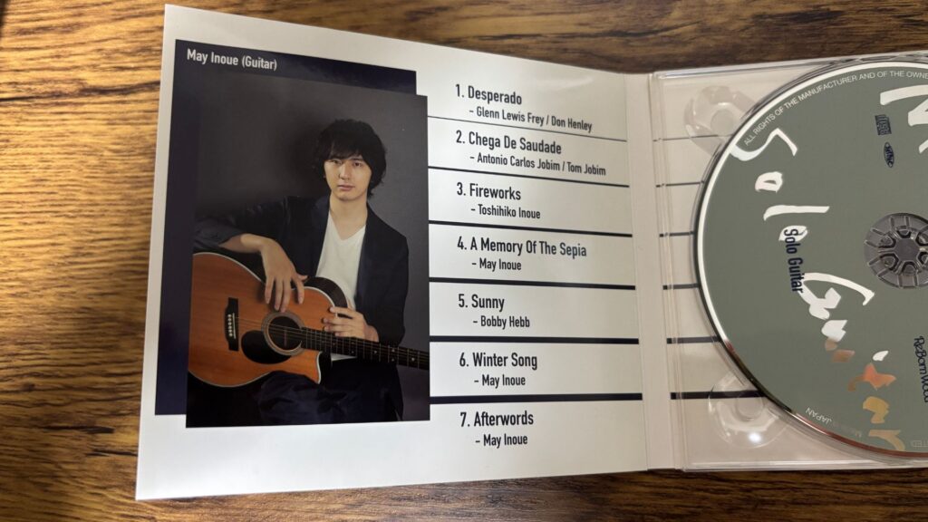 アメリカのロックバンド、イーグルスの名曲「Desperado」から始まったかと思いきや、一転してボサノヴァの巨匠、アントニオ・カルロス・ジョビンの「Chega De Saudade」、サックス奏者・井上淑彦の軽やかなオリジナル「Fireworks」へと続きます。「Sunny」が入っているところもジャズ・ギターファンには嬉しいポイントです。